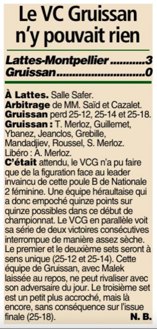 2 Victoires 2-0 face à Béziers et Mauguio, avec un groupe plus restreint les Gruissanaises ont perfectionné leur jeu offensif avec Zoé Malacamp à la baguette qui a mis toutes ses attaquantes dans les meilleures dispositions pour smasher et finir les points.
